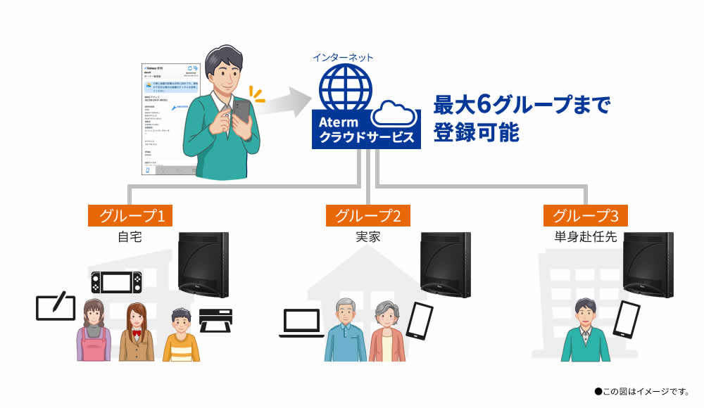 「Aterm ホームネットワークリンク」では自宅のほか、実家や単身赴任先などのWi-Fi環境も「グループ」として登録できます。最大6グループまで登録することが可能。