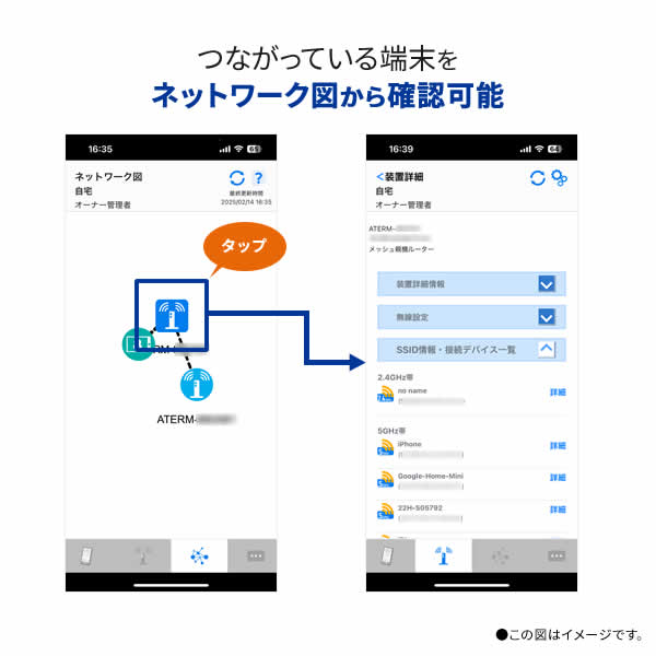 スマホアプリ「Aterm ホームネットワークリンク」を使ってメッシュ中継機の表示が可能。ネットワーク図の画面で、接続している親機/メッシュ中継機/接続端末を確認できるので安心です。