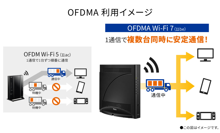 Wi-Fi 6E(11ax)登場時に注目された通信技術「OFDMA(直交周波数分割多元接続)」はWi-Fi 7(11be)でも継承され、複数の端末と接続したときでも安定した通信が可能です。