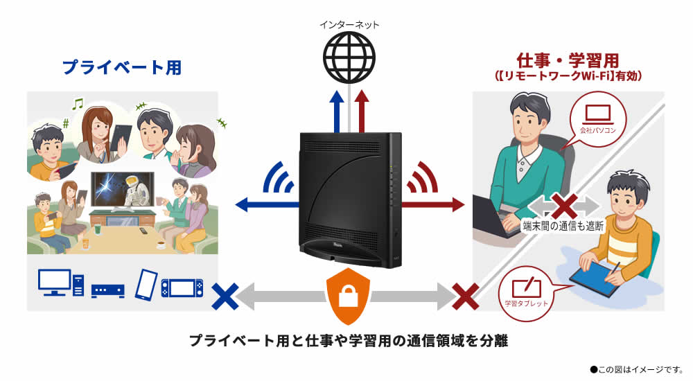 テレワークやオンライン学習が日常に浸透した今、家族が普段使いするネットワーク(プライベート用)と、仕事や学習で使うネットワークとで通信領域を分けて使える機能を工場出荷時状態から使えるのが【リモートワークWi-Fi(ネットワーク分離機能)】です。