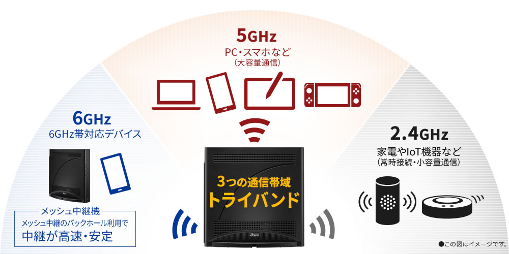 通信帯域のトライバンド化で3帯域(6GHz帯/5GHz帯/2.4GHz帯)を使い分け