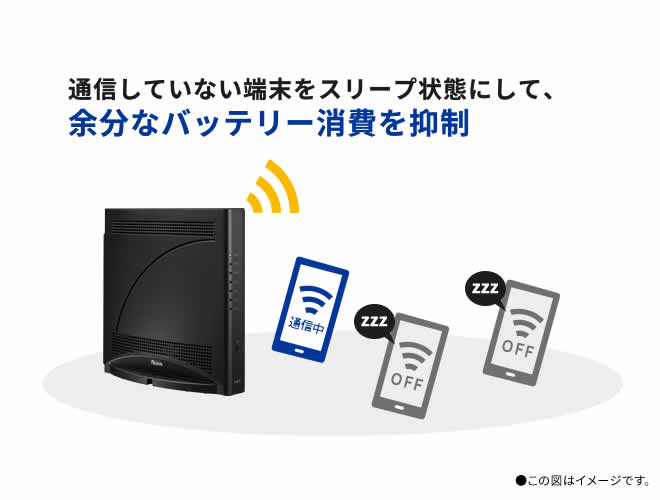 省エネ技術「TWT(Target Wake Time)」によってWi-Fiルータからスマホなどの端末へ通信するタイミングを自動で調整。順番待ちとなった端末側の通信機能をスリープ状態に移行させ、端末の余分な電池消費を抑制します。