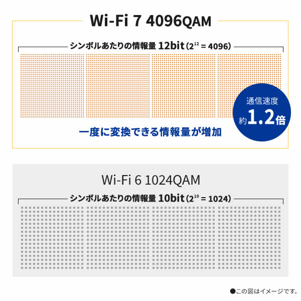 Wi-Fi 7では、このデータ変換の際の変調方式が改善され、通信の効率が向上。一度に変換できる情報量がWi-Fi 6Eの1024QAM(10bit)から、Wi-Fi 7では4096QAM(12bit)に増加し、通信速度が約1.2倍になりました。
