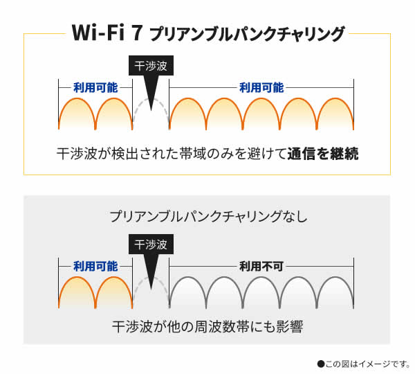 Wi-Fi 6Eなどの従来規格では、無線リンクが混雑したときは信号間の干渉が発生して通信が低下することがありますが、Wi-Fi 7では信号間の干渉を自動で検出し、干渉のある帯域のみを避けて通信の継続が可能。Wi-Fi接続の効率化を実現します。