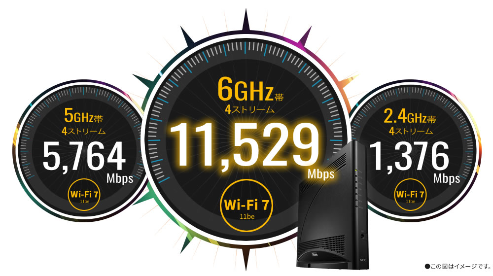 Wi-Fi 6Eの約2.4倍となる最大11,529Mbps(6GHz帯)の高速通信