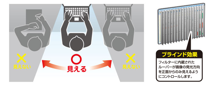 画面の正面を中心に60度(左右30度)より外の角度からは画面がまっ黒に見えるので、パソコン画面を見られる心配がありません。