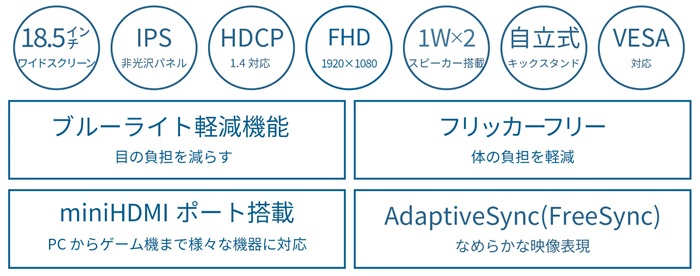 | 機能 | 【AdaptiveSync(FreeSync)】YES、【フリッカーフリー】YES、【ブルーライト軽減モード】YES、【HDCP】1.4 (miniHDMI/USB-C)、【HDR】YES miniHDMI/USB-C、【MPRT】NO、【PIP/PBP】NO |