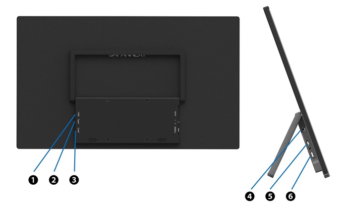 | ①miniHDMI : 2.0 (1920x1080) @60Hz ②USB-C : 1920x1080 @60Hz ③USB-C : 1920x1080 @60Hz ④オーディオ出力 ⑤ロールキー:ボタンを押して OSD メニューを開きます。 ⑥電源ボタン/戻る |