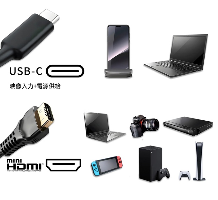 | インターフェイス | 【miniHDMI】2.0 (1920×1080) @60Hz、【USB-C 1】3.1 (1920×1080) @60Hz、【USB-C 2】3.1 (1920×1080) @60Hz、【オーディオ出力】YES、【スピーカー】1Wx2 |