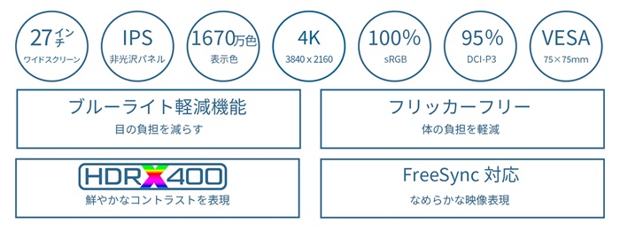 sRGB:100%、DCI-P3:95%、輝度400cd/m2の高性能パネルが画像を鮮やかな色彩でくっきりと表示します。
