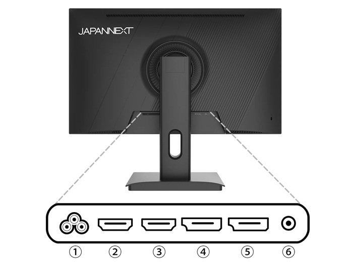 | ①電源ポート ②HDMI-2:2.0 (3840x2160) @60Hz ③HDMI-1:2.0 (3840x2160) @60Hz ④DP-2:1.2 (3840x2160) @75Hz ⑤DP-1:1.2 (3840x2160) @75Hz ⑥オーディオ出力 |