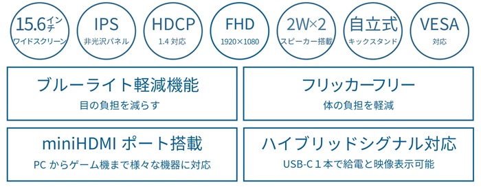 | 機能 | 【AdaptiveSync(FreeSync)】NO、【フリッカーフリー】YES、【ブルーライト軽減モード】YES、【HDCP】1.4 (miniHDMI/USB-C)、【HDR】NO、【MPRT】NO、【PIP/PBP】NO |