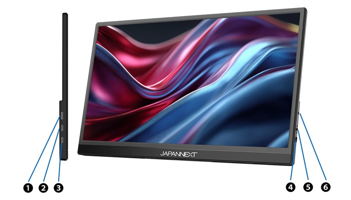 | ①miniHDMI : 2.0 (1920x1080) @60Hz ②USB-C 2 : 1920x1080 @60Hz ③USB-C 1 : 電源供給用 ④電源ボタン ⑤ロールキー ⑥オーディオ出力 |