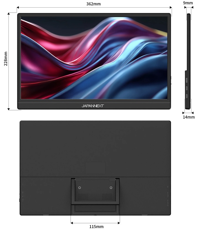 | 外形寸法 | 高228×幅362×奥行14mm、スタンド幅 115mm |