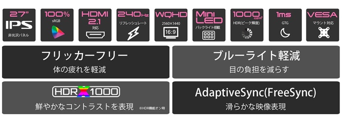 27" IPSパネル搭載 240Hz対応 WQHDゲーミングモニター