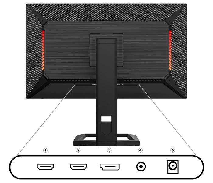 | ①HDMI-2:2.1 (2560x1440) @144Hz ②HDMI-1:2.1 (2560x1440) @144Hz ③DisplayPort:1.4 (2560x1440) @240Hz ④オーディオ出力 ⑤電源ポート ※スピーカーは非搭載となります |