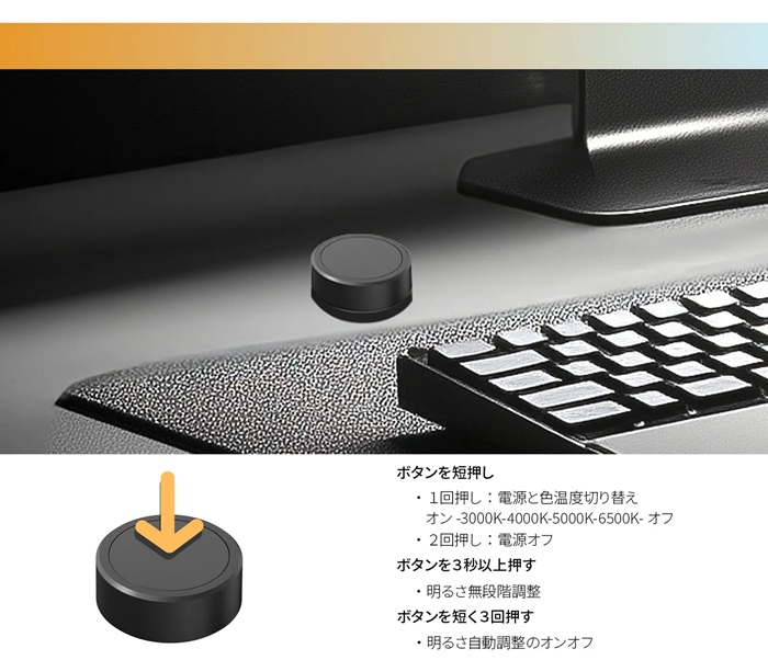 | ①調光ボタン : 明るさを 5/10/25/60/100% の 5段階で調整。 長押しで無段階調光が可能です。 ②CCT 調整ボタン : 色温度を 3000K/4000K/5000K/6500K の4段階で調整。 長押しで無段階調整が可能です。 ③光センサーボタン: 明るさ自動調整のオン/オフ。 センサーが動作時は、インジケータ ライトが青色に点灯します。 ④電源ボタン : 電源のオン/オフ。 長押しでタイマーが有効になり、2時間後に自動的に消灯します。 |