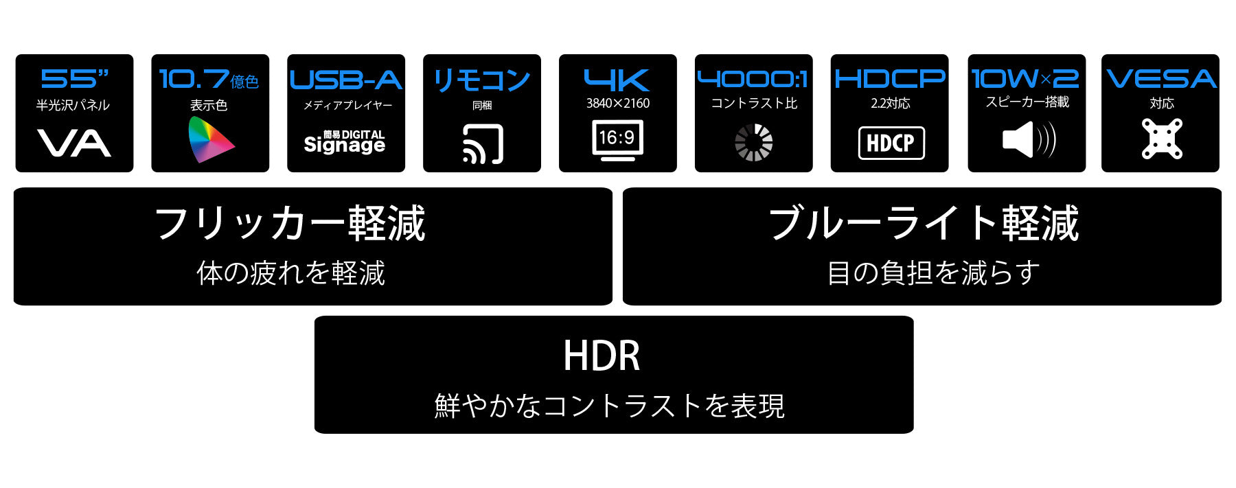 55インチの大型モニターで美しいフレームレスを実現。 ベゼル幅:上左右1.2mm液晶非表示幅:上左右5mm