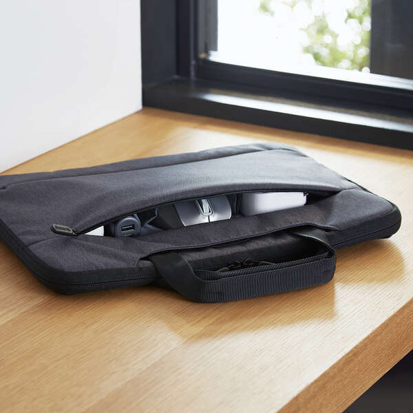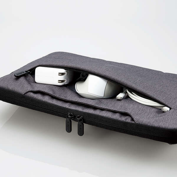 バッグ前面に、ケーブルなどの小物を整理して収納できるスリーブポケットを備えた、フロントポケットが付いています。