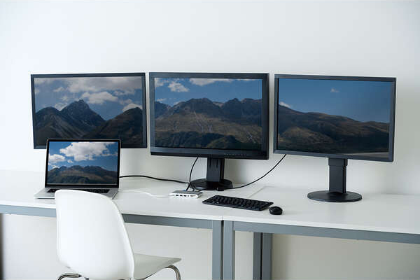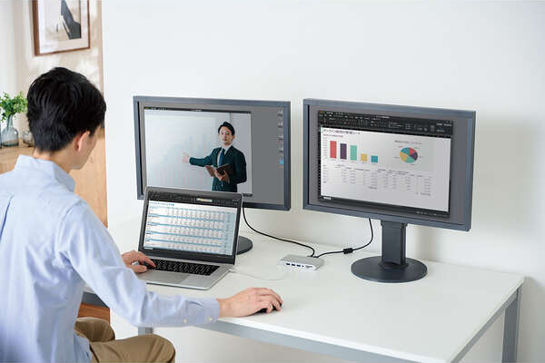 外部モニターへ映像を出力できるHDMI®、DisplayPort™、VGAポートを搭載しています。ノートパソコンと合わせて最大4画面マルチモニター(拡張または複製)の構築ができます。