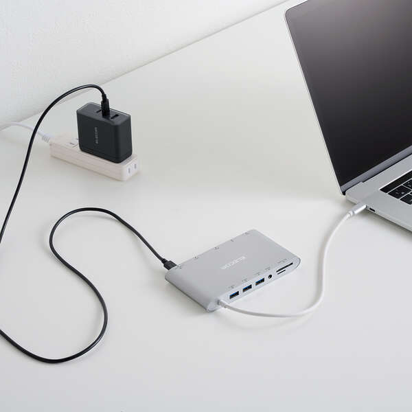 11ポートをこの1台に。薄型ノートパソコンの機能を拡張する、USB Type-C™接続ドッキングステーションです。USB Power Delivery対応で、パソコンを充電しながら周辺機器を使えます。