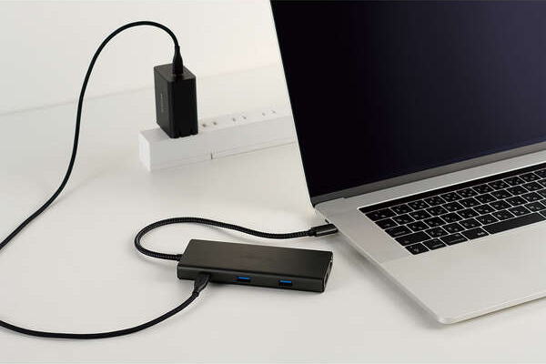 USB Type-C電源アダプターを接続することで、本製品を経由し、パソコン本体を充電することができます。