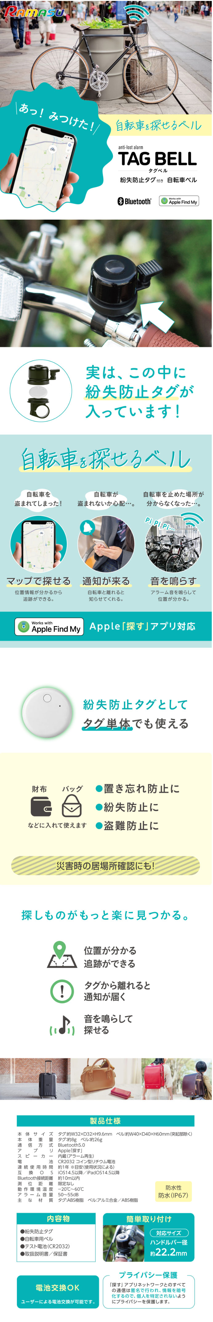 | 本体サイズ(約) | タグ W32×D32×H9.6mm / ベル W40×D40×H60mm(突起物除く) |