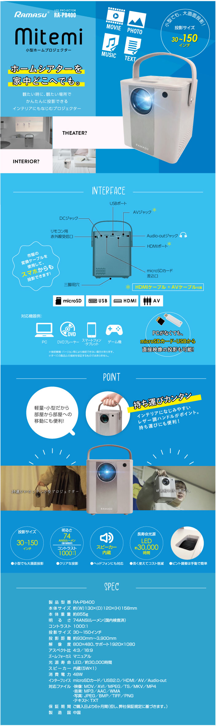 | セット内容 | 、プロジェクター本体、レンズカバー、電源アダプタ 100V 50/60Hz(ケーブル長 約150cm)、HDMIケーブル(約100cm)、AVケーブル(約100cm/入力1ピン/出力3ピン)、リモコン(単4形乾電池×2本 ※別売)、取扱説明書/保証書 |