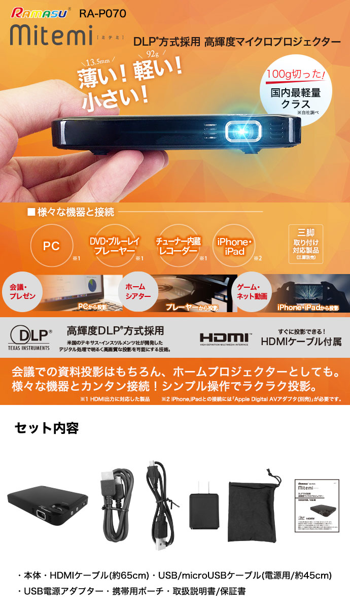 | セット内容 | 本体、HDMIケーブル (約65cm)、USB/microUSBケーブル (電源用/約45cm)、USB電源アダプター、携帯用ポーチ、取扱説明書/保証書 |