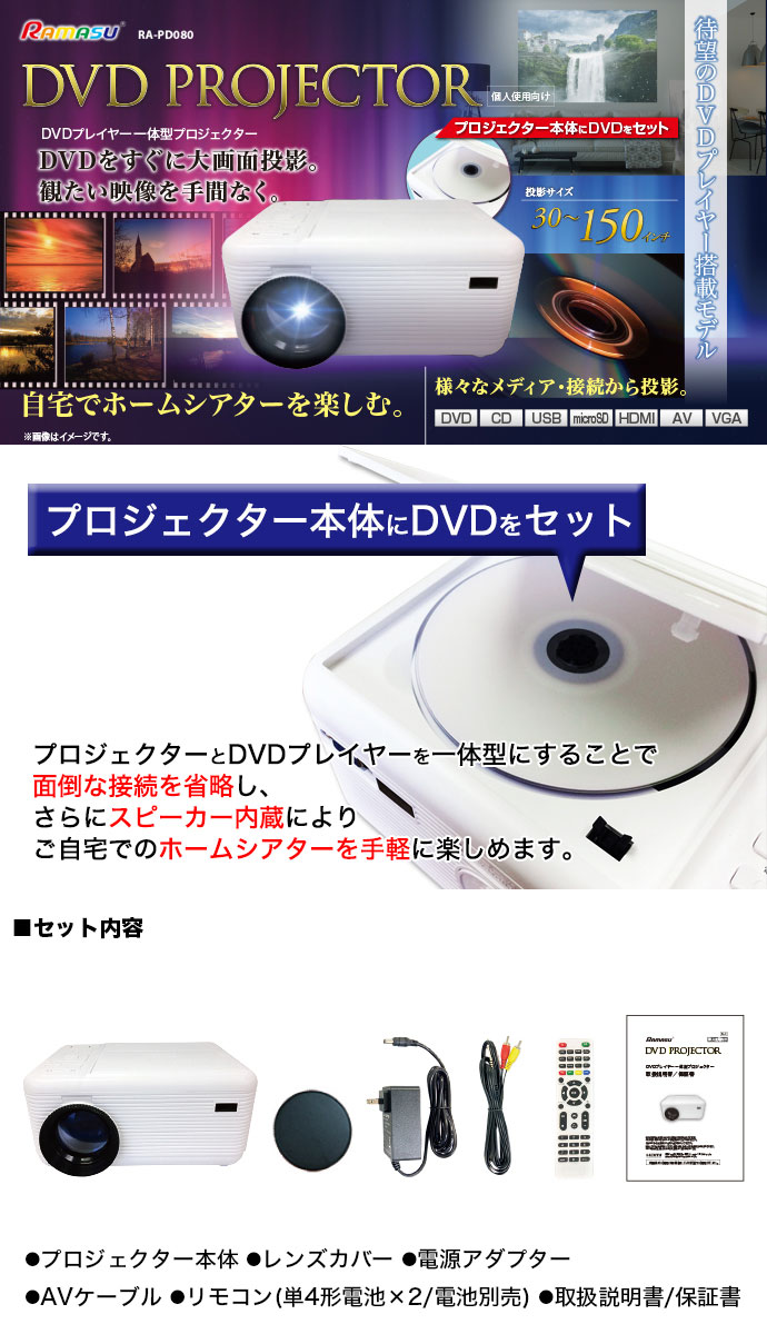 | セット内容 | 本体、レンズカバー、電源アダプター 100V 50/60Hz (約1.5m)、AVケーブル (約1.5m/入力1ピン_出力3ピン)、リモコン (単4形乾電池×2本/別売)、取扱説明書/保証書 |