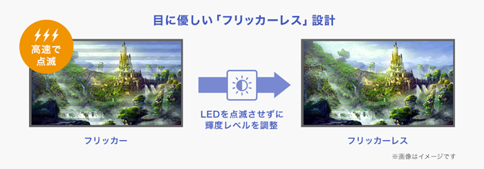 バックライトのちらつきをなくし、目の負担をやわらげる「フリッカーレス」設計