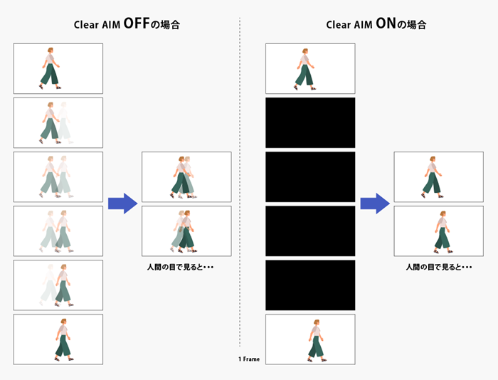 Clear AIM機能は、リフレッシュレートに応じてバックライトを点灯/消灯させ、動きの激しい映像の「ブレ(モーションブラー)」を低減できます。