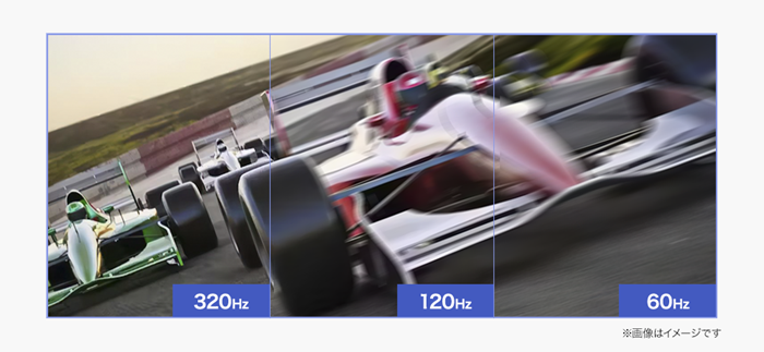 DisplayPortで最大解像度時に最大320Hzの高速リフレッシュレート対応。1秒間に最大320回映像を書き換えるので、一般的な60Hzのディスプレイの5.3倍、120Hz対応のゲーミングディスプレイの約2.6倍も高速に映像を表示させることになり、なめらかで美しい映像を表示可能です。特に、FPSなどのスピード感あふれるゲームに最適です。