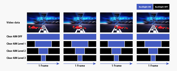 Clear AIM機能は、リフレッシュレートに応じてバックライトを点灯/消灯させ、動きの激しい映像の「ブレ(モーションブラー)」を低減できます。