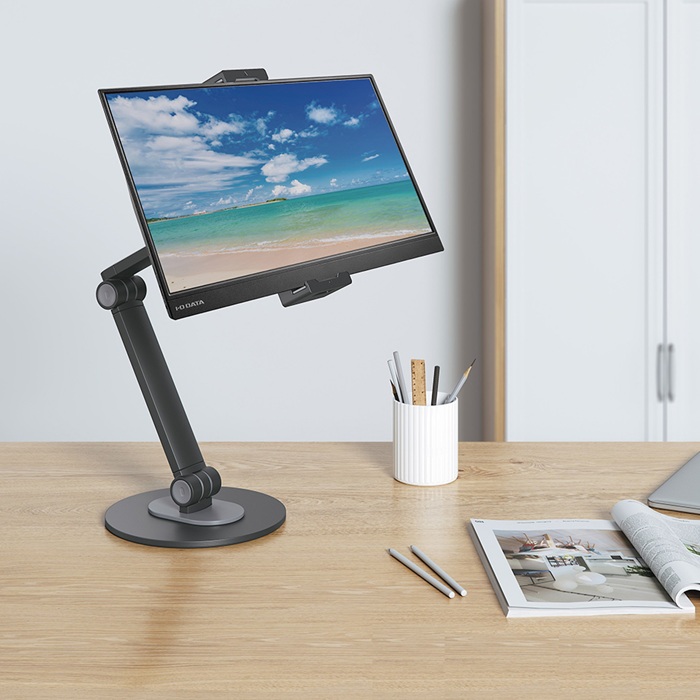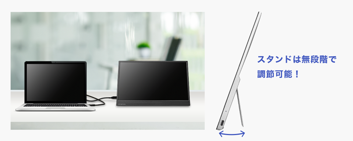 さらに、スタンド一体型で無段階調整が可能なため、見やすい角度にすばやくセットでき、外出先での作業や資料の閲覧におすすめです。