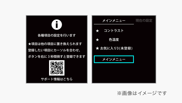 メニューにサポートページのQRコードが表示されるので、Q&Aや取扱説明書をスマホなどで簡単に閲覧できます。