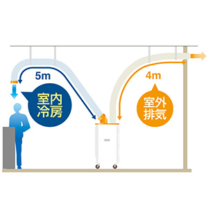 ダクトを延長し冷風を遠く離れた人へ運び、排気熱を室外に排気できます。