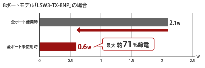 ※ 本商品「LSW3-TX-8NP」の、全ポート(8ポート)動作時と全ポート未使用時の消費電力を比較。
